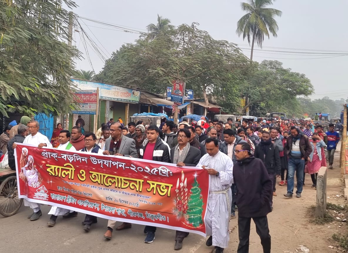 যীশুখৃষ্টের জম্মদিন উপলক্ষে পীরগঞ্জে প্রাক বড়দিন উদযাপিত হয়েছে। শনিবার বাংলাদেশ খ্রীষ্টান এসোসিয়েশন পীরগঞ্জ উপজেলা শাখার আয়োজনে এ উপলক্ষে র্যালি ও আলোচনা সভা অনুষ্ঠিত হয়। খ্রীষ্টান এসোসিয়েশনের সভাপতি রেভারেন্ড বিষ্ণুপদ রায়ের সভাপতিত্বে অনুষ্ঠিত আলোচনা সভায় বক্তব্য রাখেন উপজেলা বিএনপির সাধারণ সম্পাদক সাবেক উপজেলা চেয়ারম্যান জিয়াউল ইসলাম, থানা অফিসার ইনচার্জ মাজাহারুল ইসলাম, হিন্দু বৌদ্ধ খ্রীষ্টান ঐক্য ফন্টের কেন্দ্রীয় সহ-সভাপতি রনজিত রায়, জামায়াতে ইসলামীর ভারপ্রাপ্ত আমীর বাবুল আহম্মেদ, জেলা কমিউনিষ্ট পার্টির সাধারণ সম্পাদক অ্যাড. আবু সায়েম, প্রেসক্লাব সভাপতি জয়নাল আবেদীন বাবুল, নিউ কমিউনিটি চার্চের পরিচালক অনন্ত চাকমা, উপজেলা দুর্নীতি প্রতিরোধ কমিটির সভাপতি মোকাদ্দেস হায়াত মিলন, খ্রীষ্টান এসোসিয়েশনের সাধারণ সম্পাদক রেভারেন্ড মনোজিত রায় প্রমূখ।