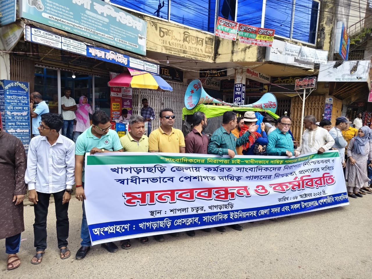 খাগড়াছড়িতে সাংবাদিকদের নিরাপত্তা ও স্বাধীনতা নিশ্চিতের দাবিতে মানববন্ধন ও কর্মবিরতি