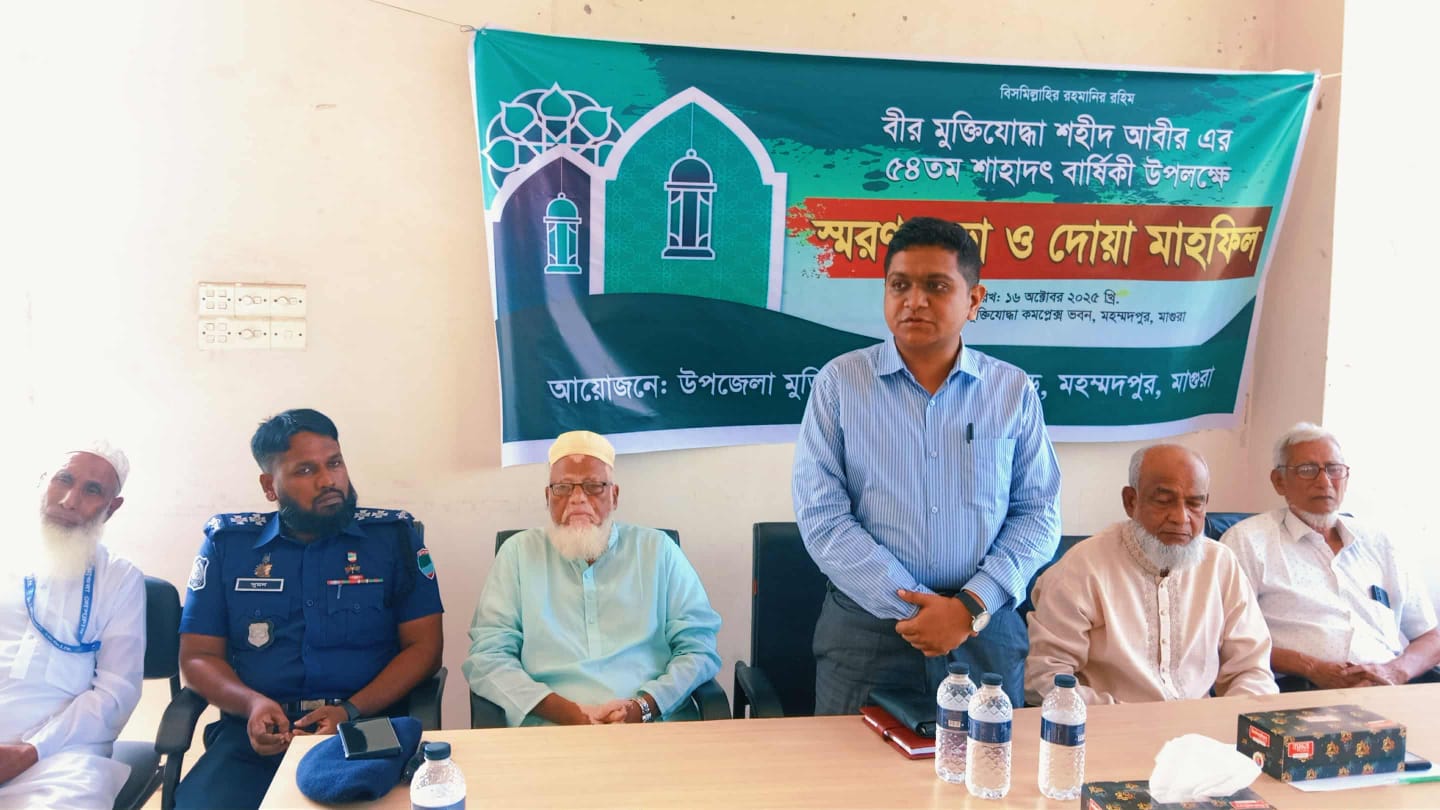 বৃহস্পতিবার বেলা সাড়ে ১১ ঘটিকায় মহম্মদপুর উপজেলা মুক্তিযোদ্ধা ইউনিট কমান্ড কাউন্সিলের আয়োজনে শহীদ বীর মুক্তিযোদ্ধা আবীর হোসেন’র শাহাদাৎ বার্ষিকী উপলক্ষে আলোচনা সভায় সভাপতির বক্তব্যে উপজেলা মুক্তিযোদ্ধা ইউনিট কমান্ড কাউন্সিলের আহ্বায়ক বীর মুক্তিযোদ্ধা অধ্যক্ষ (অব.) মোহাম্মদ মতিউর রহমান বলেন,শহীদ আবীর সাধারণ পাঠাগারসহ মুক্তিযোদ্ধাদের সকল স্থাপনা প্রতিষ্ঠিত করতে হবে।