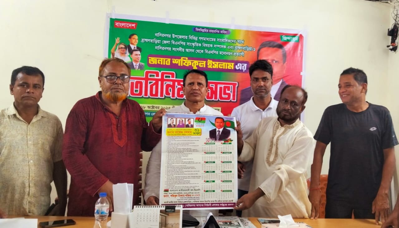 ব্রাহ্মণবাড়িয়ার নাসিরনগরে সাংবাদিকদের সঙ্গে মতবিনিময় করেছেন ব্রাহ্মণবাড়িয়া জেলা বিএনপির সাংস্কৃতিক বিষয়ক সম্পাদক ও ব্রাহ্মণবাড়িয়া – ১ আসনের বিএনপির মনোনয়ন প্রত্যাশী শফিকুল ইসলাম।
