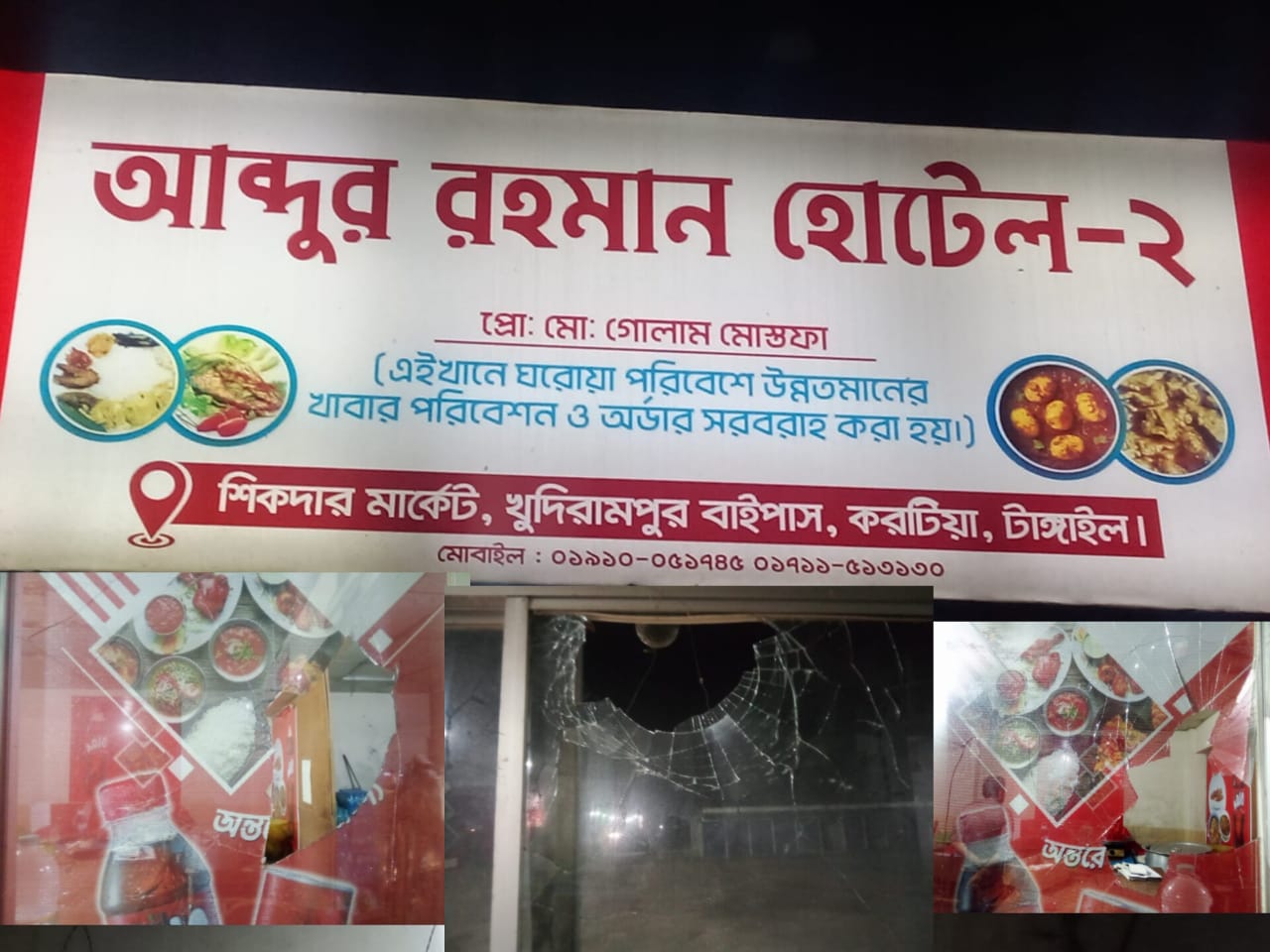 টাঙ্গাইলের সদর উপজেলার করটিয়া ইউনিয়নের ক্ষুদিরামপুর বাইপাসে আব্দুর রহমান হোটেলে চাঁদা পেয়ে হোটেল ভাংচুর করে, অর্থ লুটসহ ম্যানেজার কর্মচারীকে মারধরের অভিযোগে টাঙ্গাইল সদর থানায় এজাহার নামিয় ৪ জন ও ১০-১২ জনকে অজ্ঞাত করে একটি মামলা দায়ের করেছেন হোটেলের ম্যানেজার মো: উজ্জ্বল।