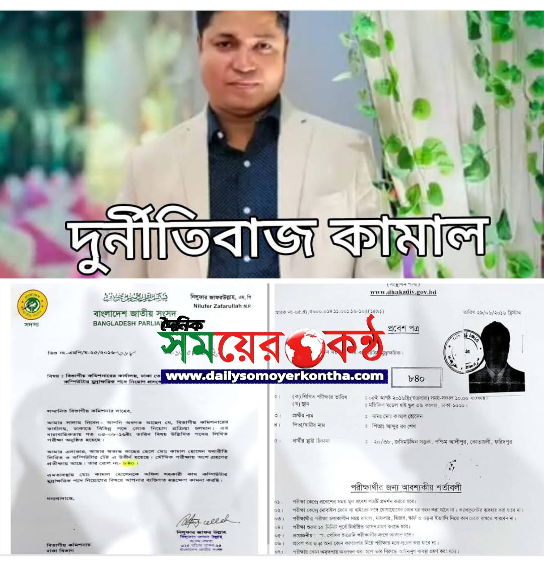 ফেসিষ্ট সরকারের আমলে ২০১৬ ইংরেজি সনের একটি প্রবেশপত্রের আলোকে কামাল হোসেন সহকারী কাম মুদ্রাক্ষরিক পদে লিখিত পরীক্ষার জন্য মোঃ মোস্তাফিজুর রহমান অতিরিক্ত বিভাগীয় কমিশনার সার্বিক ঢাকা বিভাগের স্বাক্ষরিত প্রবেশপত্রের আলোকে পরীক্ষা অংশগ্রহণ করার নোটিশ প্রদান করিলে মোঃ কামাল হোসেন নোটিশ গ্রহণপূর্বক লিখিত পরীক্ষা অংশগ্রহণ করেন।উক্ত পরীক্ষায় কৃতকার্য হওয়ার লক্ষ্যে স্থানীয় সাংসদ নিলুফা জাফরুল্লাহ এমপি ১৩।৮।২০১৬ইং তারিখের একটি বাংলাদেশ জাতীয় সংসদের একটি ডিও নং এমপি / ম-২৫/২০১৬-৩৬৮ এর আলোকে বিভাগীয় কমিশনারের কার্যালয়ে বিভিন্ন পদে লোক নিয়োগ প্রক্রিয়া চলমান গত ০৫।৮।১৬ ইং তাং উল্লিখিত পদে লিখিত পরীক্ষার অনুষ্ঠিত হয়েছে।উক্ত পদে তার রোল নং ৮৪০। এমত অবস্থায় মো: কামাল হোসেনকে অফিস সহকারী কাম কম্পিউটার মুদ্রাক্ষরিক নিয়োগের জন্য সুপারিশ করেন যা ছিল সম্পূর্ণ অবৈধ অনিয়ম আইন পরিপন্থী উক্ত সংসদের অভার টেলিফোনে তৎকালীন সময়ে কমিশনার কে কামাল হোসেনের নিয়োগের জন্য বেআইনি অনিয়মভাবে চাপ সৃষ্টি ও বাধ্য করেন।এবং মো: কামাল হোসেন কে চাকরিতে যোগদান করেন মর্মে বিভাগীয় কমিশনার কার্যালয় থেকে জানা যায়। উল্লেখ্য যে আওয়ামী লীগের সাংসদদের প্রবল চাপ নিয়োগে হস্তক্ষেপ করা কতটুক বিধি বহির্ভূত বৈধতা আছে তা বোধগম্য নহে। বর্তমানে কামাল হোসেন আওয়ামী লীগ ব্যানারে প্রতিনিয়ত সরকারের বিরুদ্ধে আচরণ করছেন তাছাড়া তাহার বিরুদ্ধে জ্ঞাত আয় সম্পদ অর্জনের সুস্পষ্ট অভিযোগ ও রয়েছে। চাকরি নিয়েই কার্যালয়ে বিভিন্ন শাখায় পোস্টিং বাগিয়ে নেন কামাল হোসেন। সেখানে তদবির বানিজ্য করে কানুনগো ও সার্ভেয়ার বদলীতে ব্যাপক অনিয়ম ও দুর্নীতি জড়িয়ে পড়েন মোঃ কামাল হোসেন। ফেসিষ্ট আওয়ামী লীগ সরকার পতনের পর শিক্ষা ও আইসিটি শাখায় থাকাকলীন সময়ে বিভিন্ন স্কুল কলেজ ও মাদ্রাসার গভর্ণিং বোর্ডের কমিটির সভাপতি নিয়োগের তদবির বানিজ্যে ও ব্যাপক অনিয়ম ও দুর্নীতি করেন এক কথায় টাকার জন্য এহেন কোন কাজ নেই যেটা তিনি করেনি। এখন সে নিষিদ্ধ কার্যক্রম আওয়ামীলীগের রোষানল ফেসিষ্ট থেকে নিজেকে বাঁচানোর জন্য কখনো এনসিপি, কখনো বিএনপির,লোক বলে দাবী করেন। বতর্মান সে মোটা অংকের টাকা খরচ করে তদবির করে বর্তমানে ঢাকা বিভাগীয় কমিশনারের কার্যালয়ের হল্ডিং ট্যাক্স আপিল বিভাগের উত্তর সিটি কর্পোরেশনে দায়িত্বে নিয়োজিত এবং চাকুরীতে কর্মরত আছেন এই শাখায় ও পোষ্টিংও নিয়েছেন তদবিরের মাধ্যমে। তার নিজের কোন যোগ্যতা না থাকলেও তার তদবিরে সংসদ এমপির কারনে কতৃপক্ষ নিরুপায় হয়ে যায়। তাছাড়া বিশেষ সূত্রে জানা যায় তাহার চাকরি করা কালীন সময়ে দুর্নীতির মাধ্যমে নামে বেনামে গড়েছ