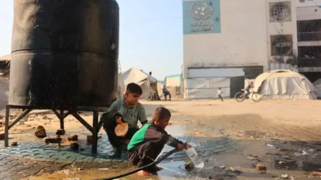 বাস্তুচ্যুত ফিলিস্তিনিদের জন্য একটি শিবিরে একটি ছেলে প্লাস্টিকের বোতলে পানি ভরছে। ছবি: সংগৃহীত ইসরায়েলের হামলায় গাজায় পুরো এলাকা ধ্বংসের পাশাপাশি