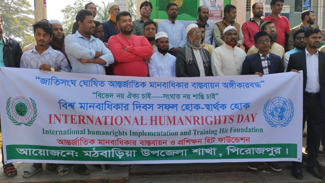 এই স্লোগানকে সামনে রেখে আন্তর্জাতিক মানবাধিকার বাস্তবায়ন ও প্রশিক্ষণ হিট ফাউন্ডেশন পিরোজপুর জেলা মঠবাড়ীয়া উপজেলায় যথাযথ মর্যাদায় রেলী ও আলোচনা