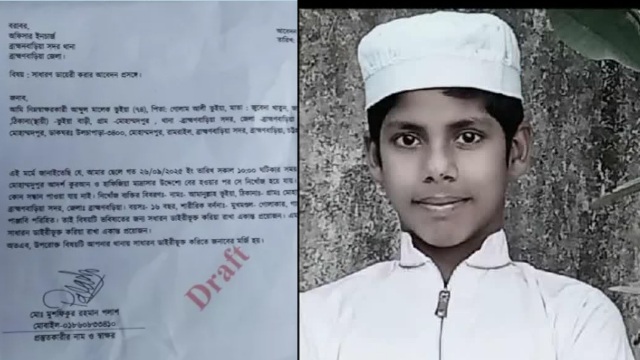 আমার ছেলে গত ২৬/০৯/২০২৫ ইং তারিখ সকাল ১০:০০ ঘটিকার সময় মোহাম্মদপুর আমার নিজ বাসস্থল হইতে মোহাম্মদুপুর আদর্শ কুরআন ও হাফিজিয়া