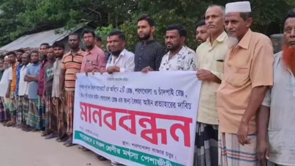 সুন্দরবন পূর্ব বিভাগের দুটি রেঞ্জের বৈষম্য আইন প্রত্যাহারের দাবিতে মানববন্ধন কর্মসূচি পালন করেছে মৎস্যজীবী ও পেশাজীবীরা। মানববন্ধনে একাত্মতা প্রকাশ করেন